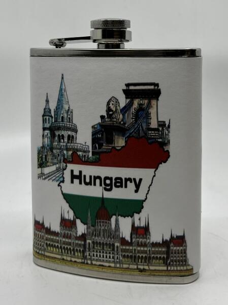 8 oz űrtartalmú flaska, Hungary feliratú, mintás műbőr bevonattal. Kiváló ajándékötlet külföldi ismerősnek, barátnak.